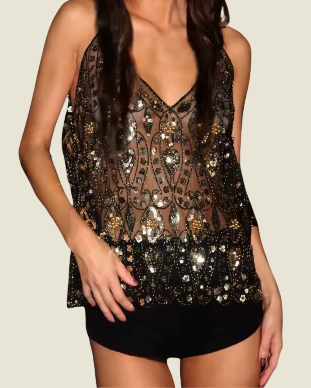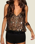 Descrição: Blusa de alças finas com decote em V, adornada com lantejoulas e pedrarias delicadas. Possui acabamento refinado e modelagem solta.