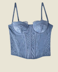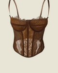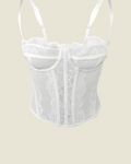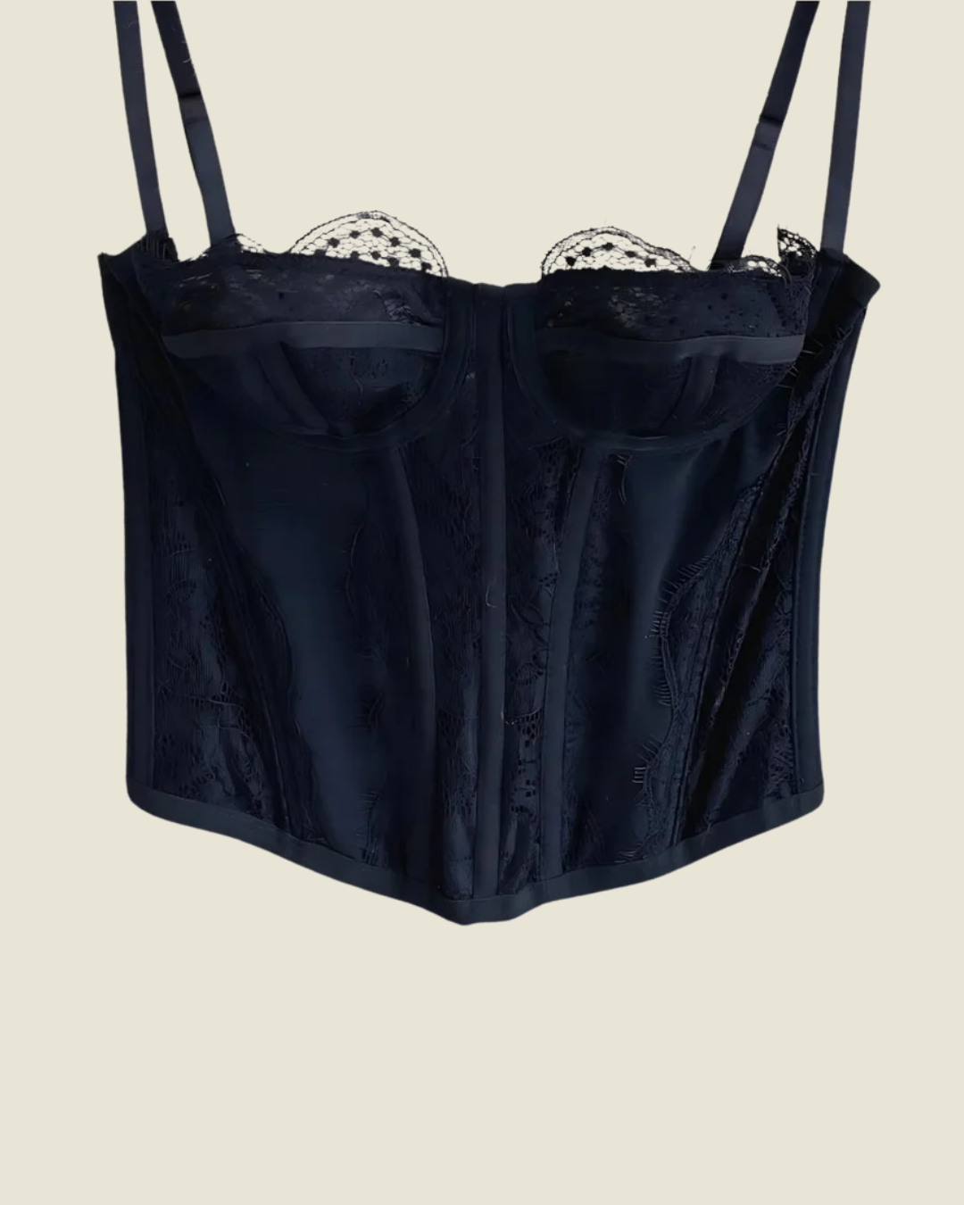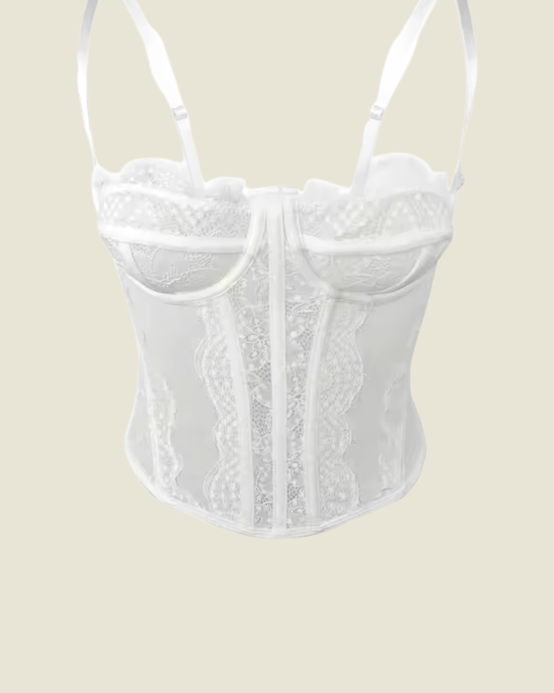 Corset de alças finas em renda bordada com forro interno macio, modelagem ajustada e recortes que valorizam a cintura.